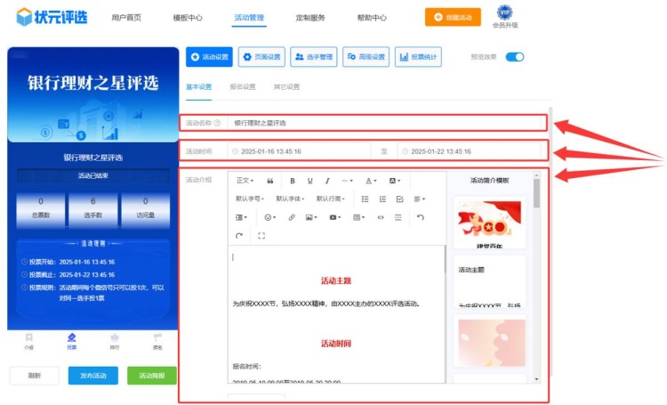 第三步,在【活动设置】中,将活动名称改为银行理财之星评选,并设置活动起止时间,编辑活动介绍。