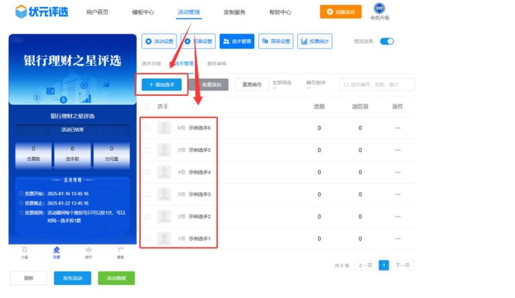 第五步,在【选手管理】中点击【添加选手】或者【示例选手】,上传所有选手的个人资料,包括选手的名称、简介、照片或者视频等。