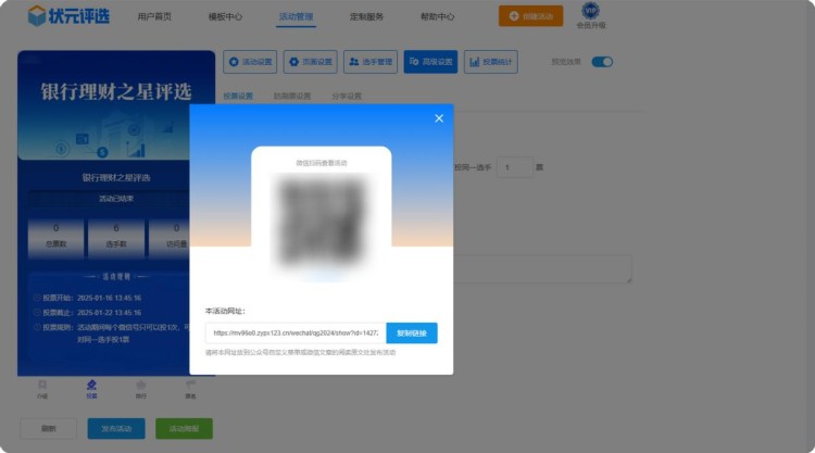 第七步,上述步骤且仔细检查确定无误后,点击【发布活动】,系统会自动生成投票链接和二维码。这样银行理财之星在线投票评选活动就制作完成了,您学会了吗?