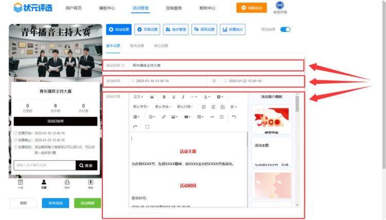 第三步,在【活动设置】中,将活动名称改为青年播音主持大赛,并设置活动起止时间,编辑活动介绍。