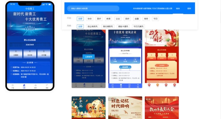 其次,登录后,系统会自动跳转至活动后台。在【模板中心】,能看到各种风格的模板,如政法服务之星、最美风景、十佳优秀建筑企业等。