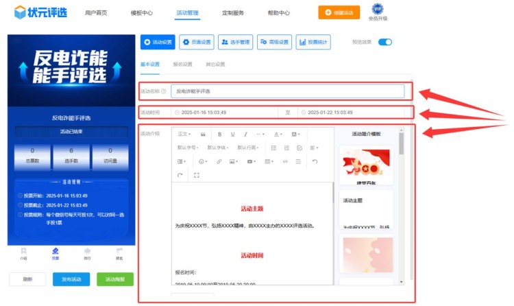 再者,在【活动设置】中,编辑活动信息,包括活动名称、时间、简介。