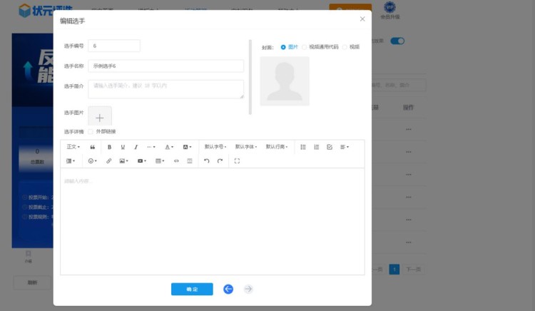 然后,在【选手管理】中,上传所有选手的个人资料,包括选手的名称、简介、照片或者视频等。