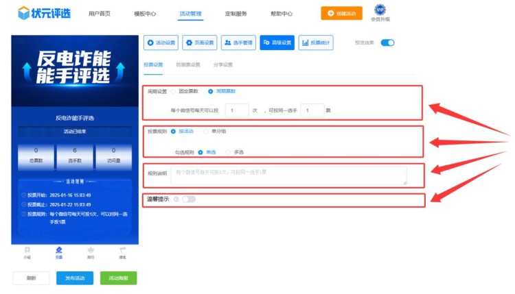 再然后,在【高级设置】中,完成投票规则的设置。