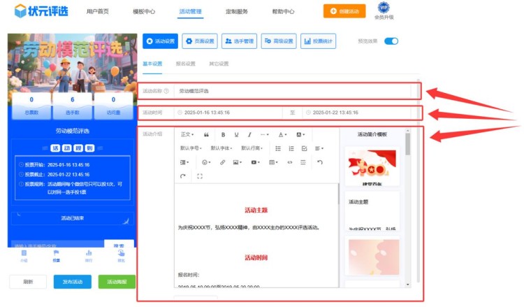 第三步,在【活动设置】中,将活动名称改为劳动模范评选,并设置活动起止时间、编辑活动介绍。