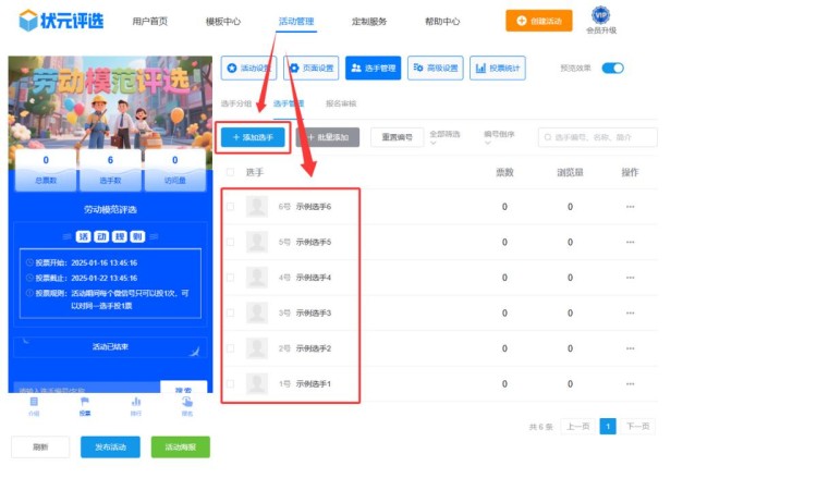 第五步,在【选手管理】中,上传所有选手的个人资料,包括选手的名称、简介、照片或者视频等。