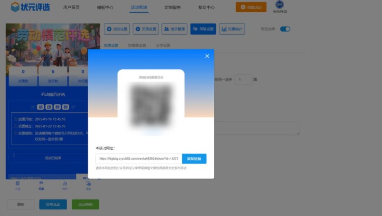 第七步,上面这些步骤都完成,且仔细检查确定没有问题之后,点击【发布活动】,系统会自动生成投票链接和二维码。这样劳动模范网络投票活动就制作完成了,您学会了吗?