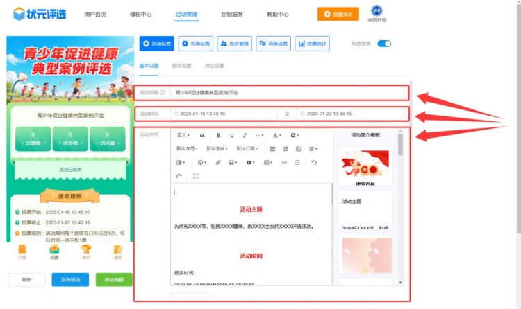 第三步,在【活动设置】中,将活动名称改为青少年促进健康典型案例评选,并设置活动开始和结束的时间,以及编辑活动介绍。