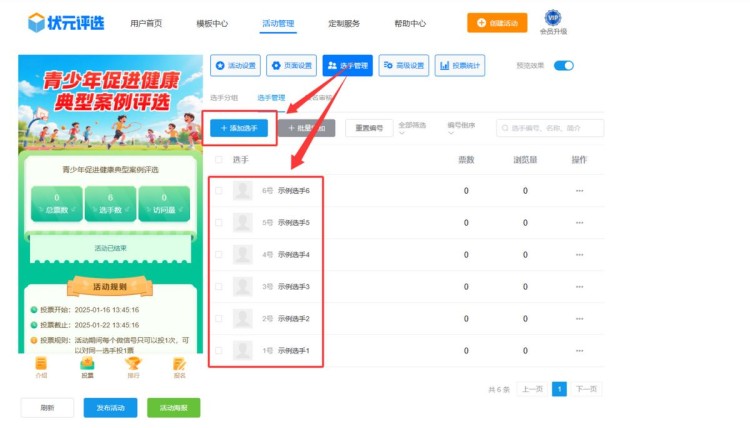 第五步,在【选手管理】中,上传所有选手的个人资料,包括选手的名称、简介、照片或者视频等。