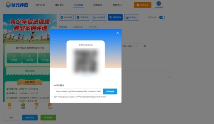 第七步,上述步骤完成后,点击【发布活动】,系统会自动生成投票链接和二维码。这样青少年促进健康典型案例网络评选活动就制作完成了,您学会了吗?