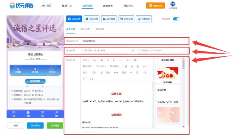 第三步,在【活动设置】中,编辑活动名称、设置活动起止时间、编辑活动介绍。