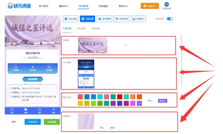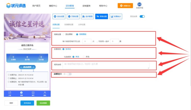 第六步,在【高级设置】中,设置投票规则,如活动期间,可以给几名选手投票、又可以投几票等。