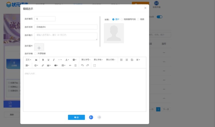 第五步,在【选手管理】中,上传所有选手的个人资料,包括选手的名称、简介、照片或者视频等。