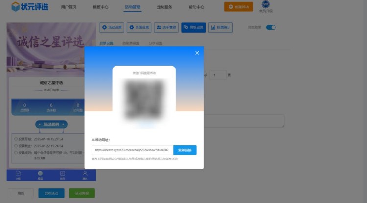 第七步,完成上述操作并仔细核对无误后,点击【发布活动】按钮,系统会自动生成投票链接与二维码。保存好这些信息并进行分享,就能开始微信评选活动,最终选出优胜者。