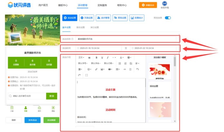 第三步,在【活动设置】中,修改活动名称、设置活动起止时间、编辑活动介绍。