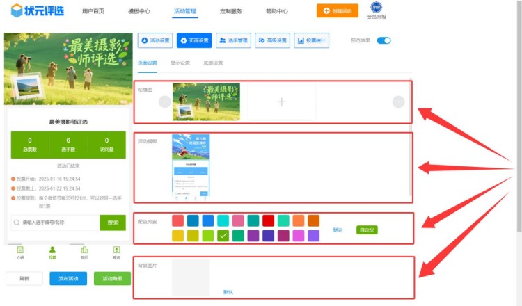 第四步,在【页面设置】中,上传主题轮播图,并根据轮播图的颜色,来调整配色方案、更换背景图片等。