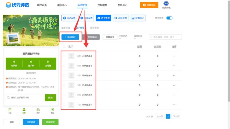 第五步,在【选手管理】中,上传所有选手的个人资料,包括选手的名称、简介、照片或者视频等。