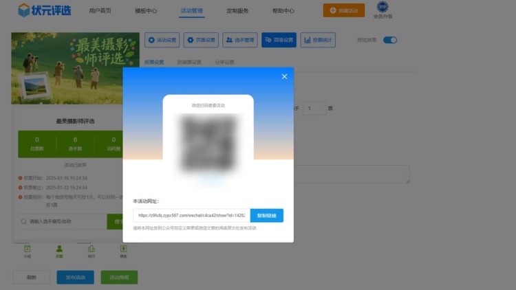 第七步,上述步骤完成,且仔细检查确定没有问题后,点击【发布活动】,系统会自动生成投票链接和二维码。将其保存下来并分享至微信群、朋友圈等社交媒体上,即可开启微信评选活动,选出最终的获胜者。