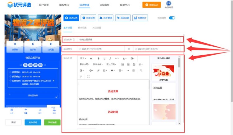 第三步,在【活动设置】中,将活动名称改为物流之星评选,并设置活动时间、编辑活动介绍。