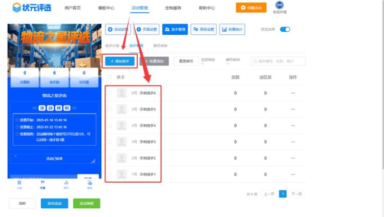 第五步,在【选手管理】中,上传所有选手的个人资料,包括选手的名称、简介、照片或者视频等。