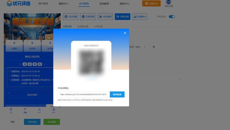 第七步,上面这些操作都完成,点击【发布活动】,系统会自动生成投票链接和二维码。这样物流之星微信评选活动就制作完成了,是不是很简单?