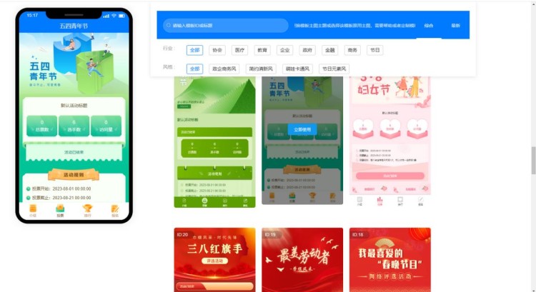其次,成功登录后,系统会自动跳转至活动后台。在【模板中心】,可以看到各式各样的模板,如十佳优秀建筑企业、少年宫科技展、五一劳动节等,选择合适的一键套用。