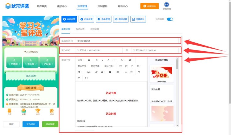 再者,在【活动设置】中,编辑活动信息,包括活动名称、时间、简介。