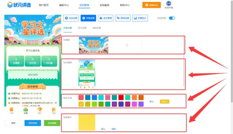接下来,在【页面设置】中,上传主题轮播图,并根据活动需要,完成其他页面设置上的操作,如添加背景音乐、漂浮物等。