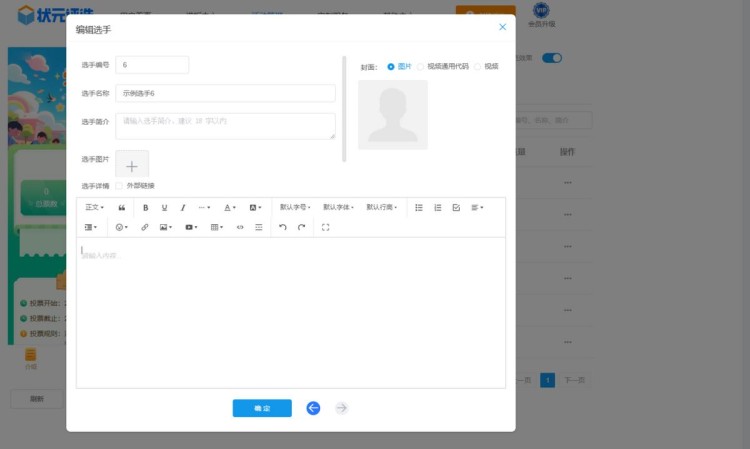 然后,在【选手管理】中,上传所有选手的个人资料,包括选手的名称、简介、照片或者视频等。