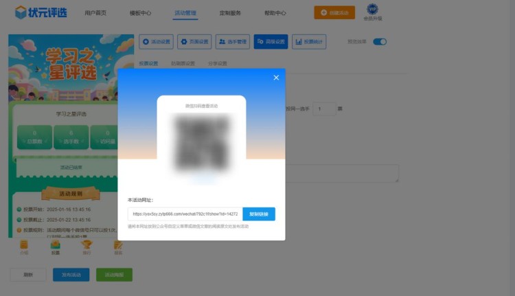 最后,点击【发布活动】,系统会自动生成投票链接和二维码。这样一场微信投票活动就制作完成了,是不是很简单?