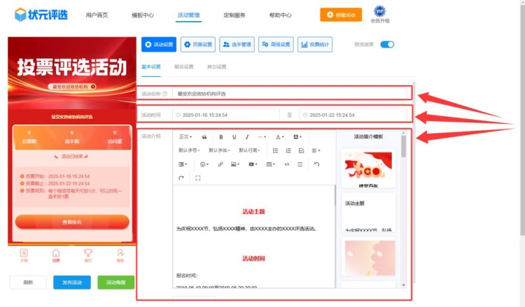 第三步,在【活动设置】中,将活动名称改为最受欢迎政协机构评选,并设置活动起止时间、编辑活动介绍。