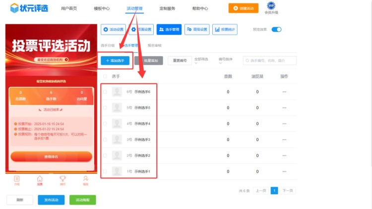 第五步,在【选手管理】中点击【添加选手】或者【示例选手】,上传所有选手的个人资料,包括选手的名称、简介、照片或者视频等。