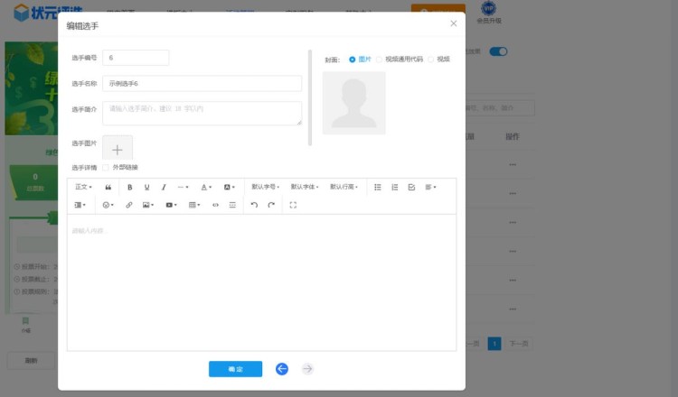 然后,在【选手管理】中,上传所有选手的个人资料,包括选手的名称、简介、照片或者视频等。