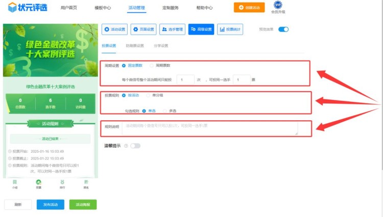 再然后,在【高级设置】中,设置投票规则,如活动期间,可以给几名选手投票、又可以投几票等。