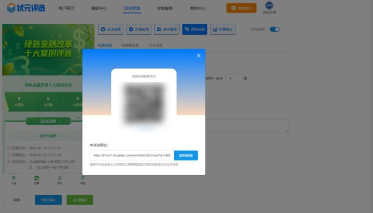 最后,上面这些步骤完成,且仔细检查确定无误后,点击【发布活动】,系统会自动生成投票链接和二维码。这样一场微信投票活动就制作完成了,是不是很简单?