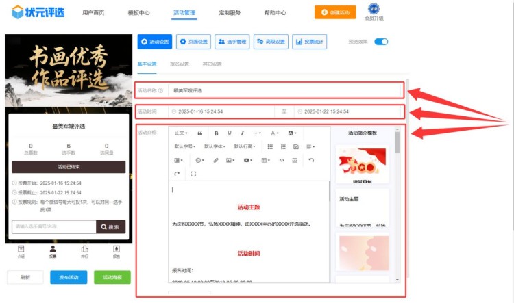 第三步,在【活动设置】中,修改活动名称、设置活动时间、编辑活动介绍。