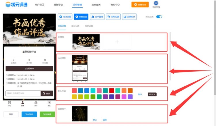 第四步,在【页面设置】中,上传主题轮播图,并根据轮播图的颜色,来调整配色方案、更换背景图片等。