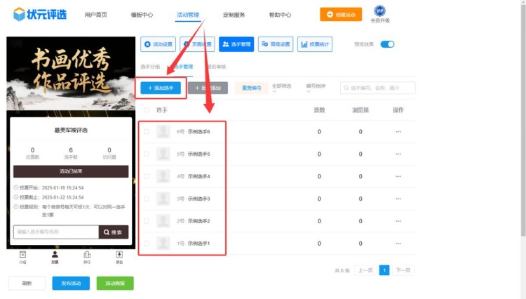 第五步,在【选手管理】中,上传所有选手的个人资料,包括选手的名称、简介、照片或者视频等。