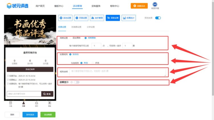 选对投票制作工具(比如状元评选),创建评选活动真能事半功倍。优质工具自带模板库,从校园之星到企业评选,一键套用就能生成基础框架,无需从零设计页面。它能兼容图文、视频等素材展示,候选人资料上传、投票规则设置(如每日票数限制、防刷票开关)都有可视化操作界面,新手也能快速上手。更重要的是,状元评选自带微信适配功能,生成的投票链接可嵌入公众号,数据实时同步,省去技术开发和维护成本。选对工具,从活动创建到上线往往只需几分钟,让组织者专注内容本身,轻松搞定评选活动。