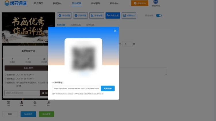 第七步,上述步骤完成且仔细检查确定无误后,点击【发布活动】,系统会自动生成投票链接和二维码。将其保存下来并分享出去,即可开启微信投票活动,选出最终的获胜者。