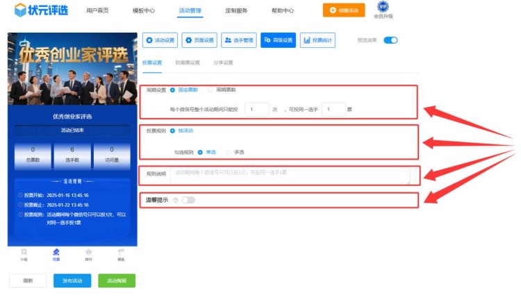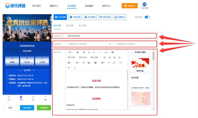 第三步,在【活动设置】中,将活动名称改为优秀创业家评选,并设置活动起止时间,编辑活动介绍。