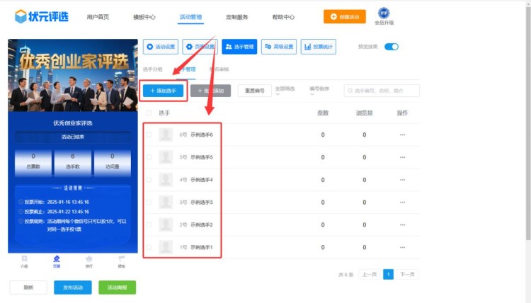 第五步,在【选手管理】中,上传所有选手的个人资料,包括选手的名称、简介、照片或者视频等。