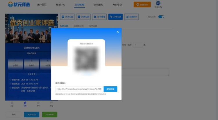 第七步,上面这些操作都完成,且检查无误后,点击【发布活动】,系统会自动生成投票链接和二维码。这样优秀创业家网络评选活动就制作完成了,是不是很简单?