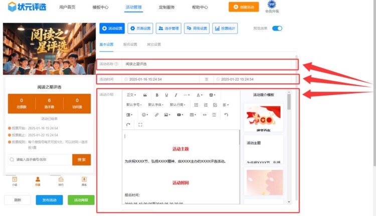 再者,在【活动设置】中,编辑活动信息,包括活动名称、时间、简介。
