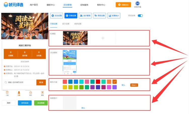 接下来,在【页面设置】中,上传主题轮播图,并根据轮播图的颜色,来调整配色方案、更换背景图片等。
