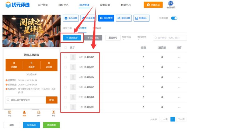 然后,在【选手管理】中,上传所有选手的个人资料,包括选手的名称、简介、照片或者视频等。