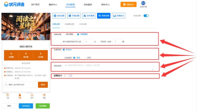 网络投票制作看似复杂,实则有窍门可循。初涉其中,别被众多功能选项吓倒。多数平台都有简洁直观的模板区(比如状元评选),依活动类型筛选契合的模板,能极大简化制作流程,避免从头搭建的繁琐。在信息设置环节,从活动名称、起止时间到详细介绍,务必精准清晰,这关乎参与者对活动的第一印象与理解程度。添加选手或选项资料时,保证内容完整、格式规范,让参与者能充分了解各个对象。而投票规则设定,如投票次数、是否匿名等,要提前规划好,以保障公平公正。跟着这些思路,一步步推进,就能轻松驾驭网络投票制作平台,顺利开启专属投票活动。