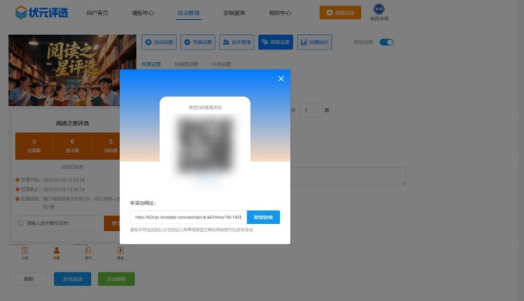 最后,上述步骤完成,且仔细检查确定无误后,点击【发布活动】,系统会自动生成投票链接和二维码。这样一场网络投票活动就制作完成了,您学会了吗?