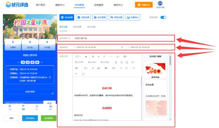 再者,在【活动设置】中,编辑活动信息,包括活动名称、时间、简介。
