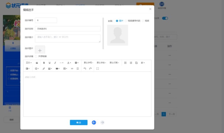 然后,在【选手管理】中,上传所有选手的个人资料,包括选手的名称、简介、照片或者视频等。